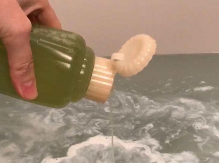 二層式のボトルをよく振ってから湯船に注ぐと透明だったお湯が乳白色に変わり、一日の疲れを優しく包み込んでくれます。