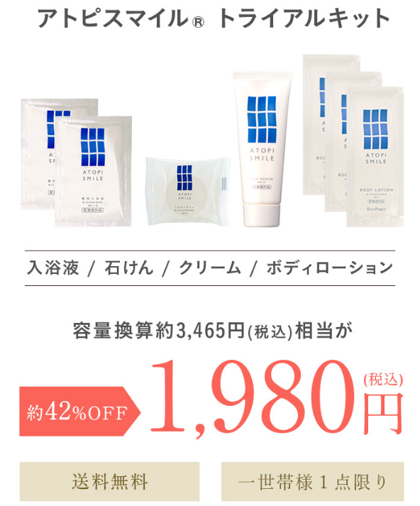 アトピスマイルの公式サイトではトライアルキットが1,980円で試せるので、気になっている方は、まずはそちらで自分の肌との相性を確かめるのが良いと思います。
