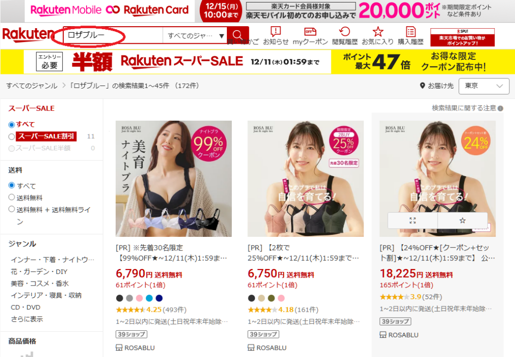 楽天やAmazonでロザブルーを購入する場合、ポイント還元があるのはメリットですがサイズ交換保証など特典がない場合もあります。
