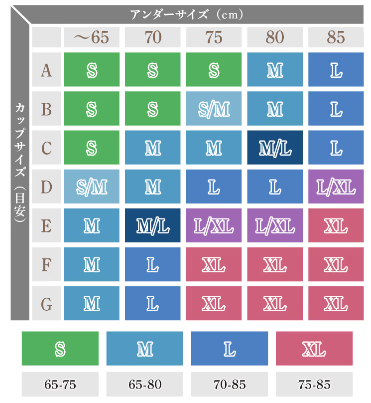 ロザブルーはSからXLまでのサイズ展開があり、基本的には普段使っているブラジャーのサイズを基準に選びます。